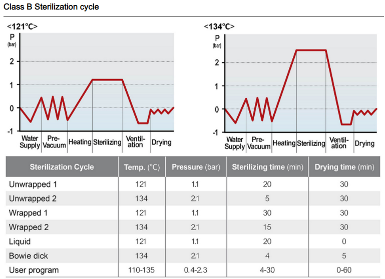 Chu trình tiệt trùng loại B: Tiền hút chân không để loại bỏ không khí với 3 giai đoạn thâm nhập hơi nước xung động sau hút chân không để sấy chân không và làm mát không khí được lọc HEPA. Dùng cho bất kỳ loại thiết bị y tế nào, chẳng hạn như thiết bị rắn đóng gói hoặc không đóng gói, dụng cụ lỏng hoặc rỗng