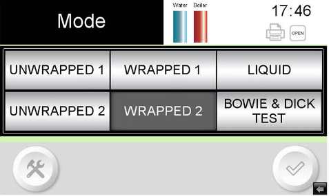 Chu trình: Không đóng gói 1&2, đóng gói1&2, lỏng, Bowie-dick, chương trình người sử dụng